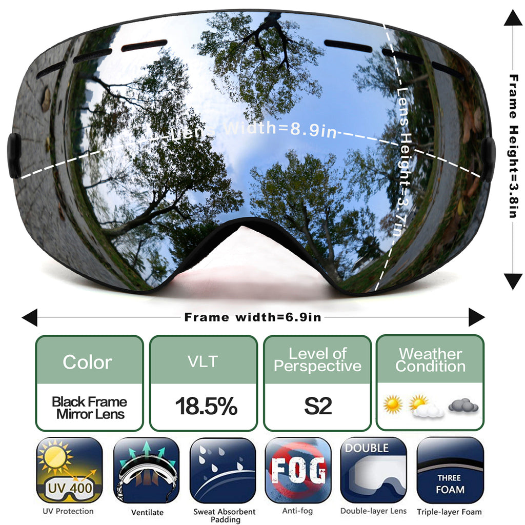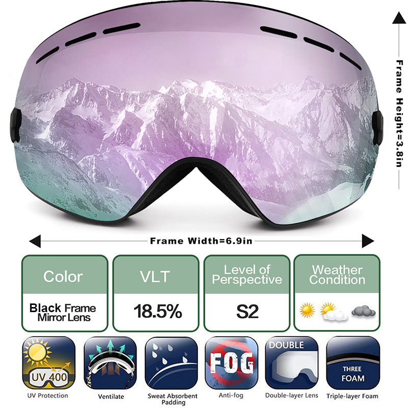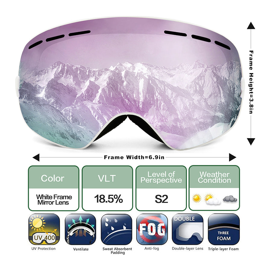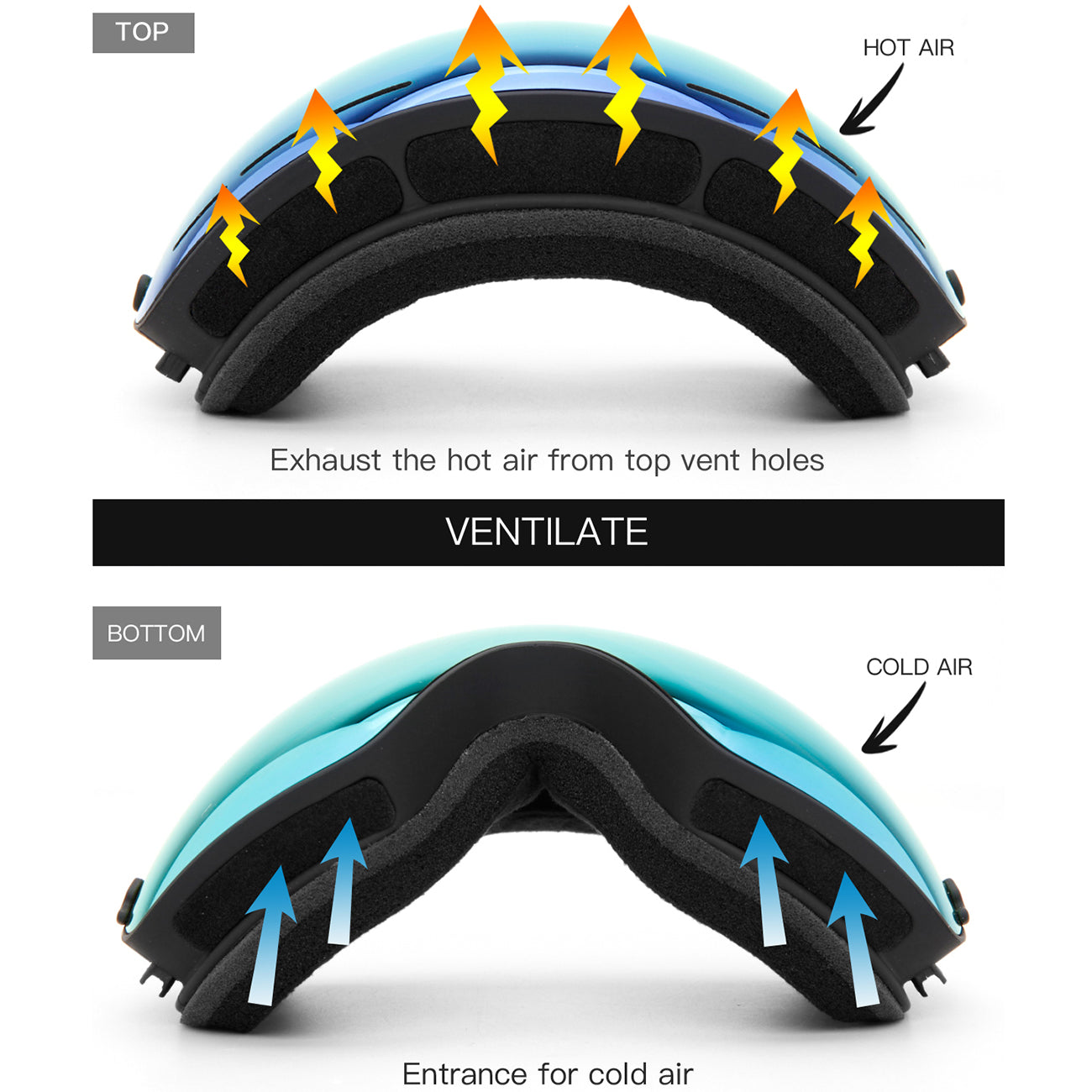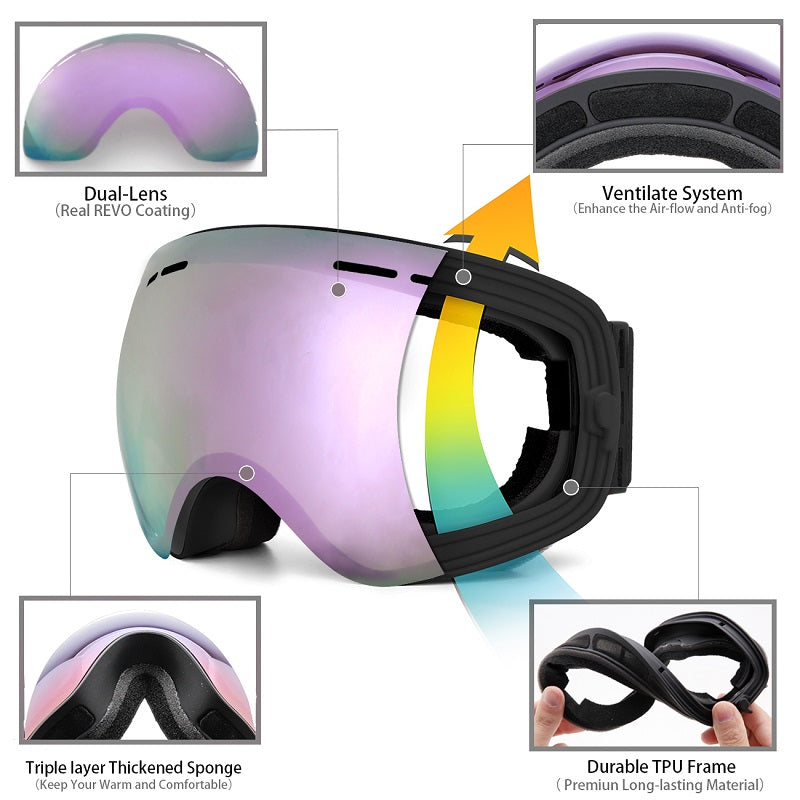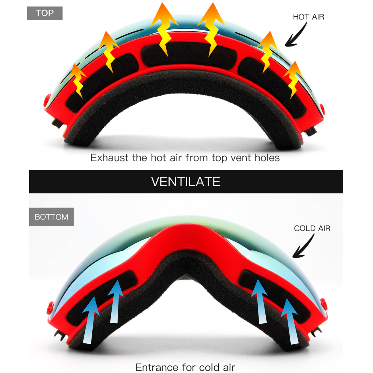 PROFESSIONAL VENTILATION & FRAMELESS DESIGN-Designed to reduce fogging and optimizes the flowing air over the inside of the lens. ski goggles provide smooth air-flow system which brings fresh air and exhaust moisture quickly and effectively. The big, spherical, frameless lens provides a truly unobstructed & clear view of the slopes.