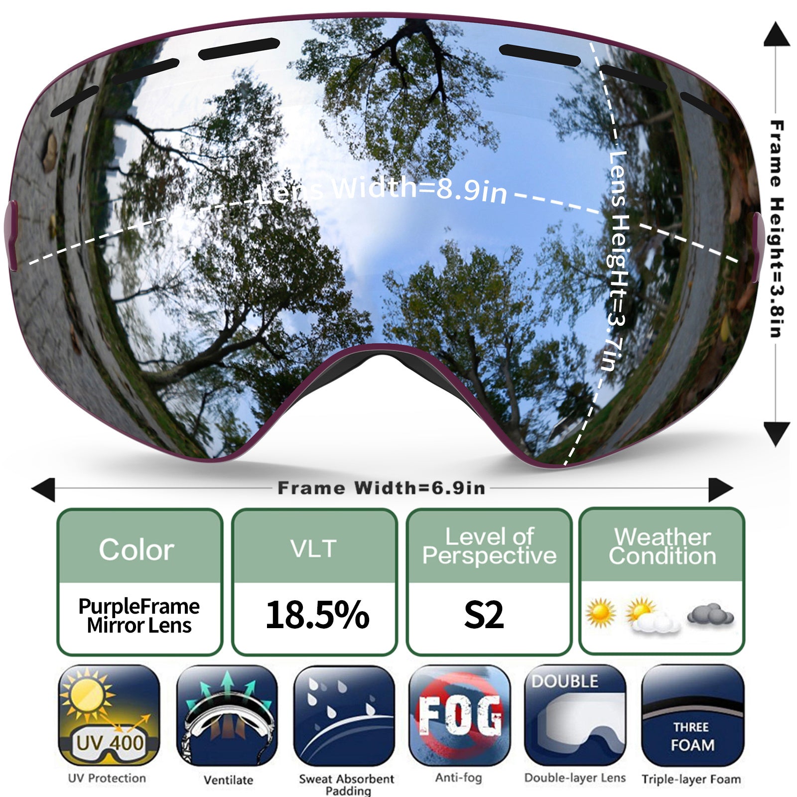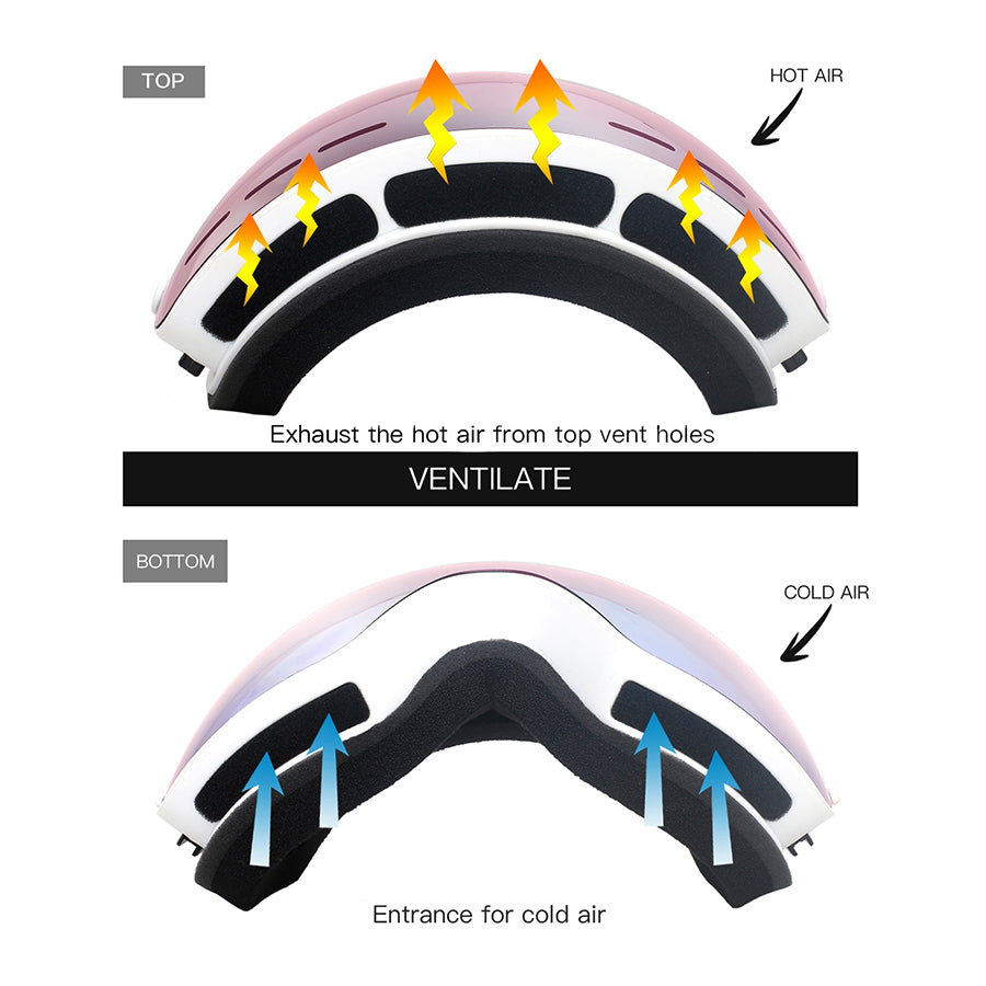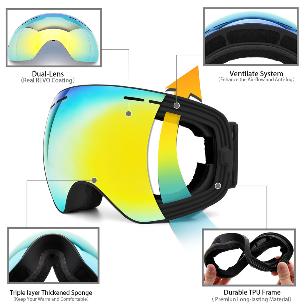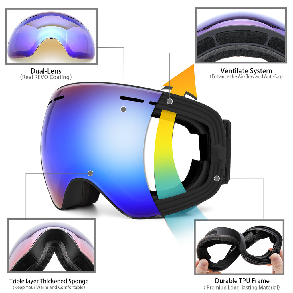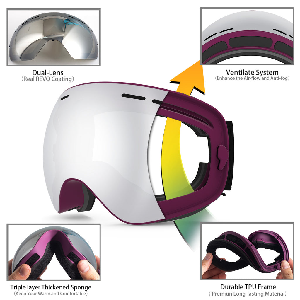 PROFESSIONAL VENTILATION & FRAMELESS DESIGN-Designed to reduce fogging and optimizes the flowing air over the inside of the lens. ski goggles provide smooth air-flow system which brings fresh air and exhaust moisture quickly and effectively. The big, spherical, frameless lens provides a truly unobstructed & clear view of the slopes.