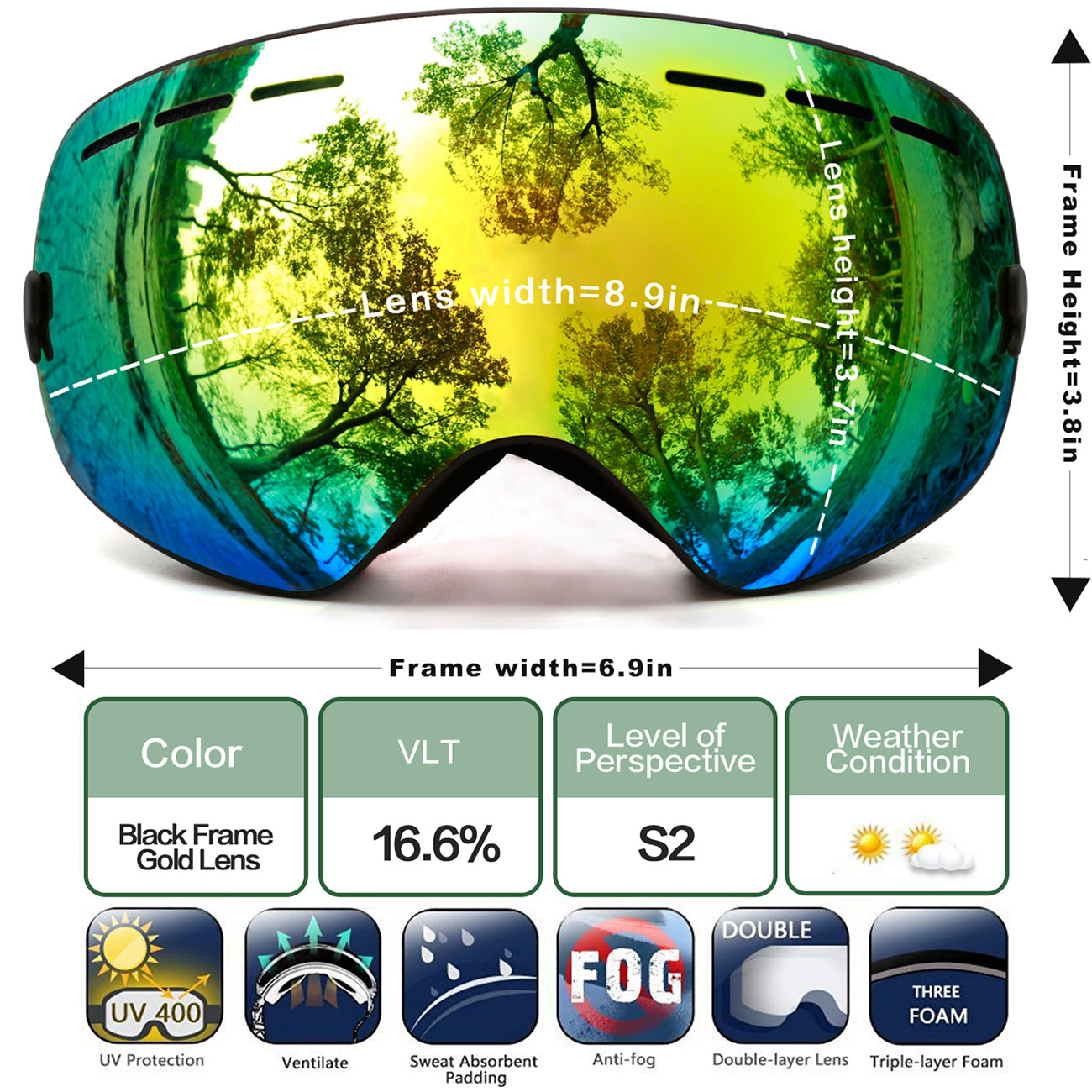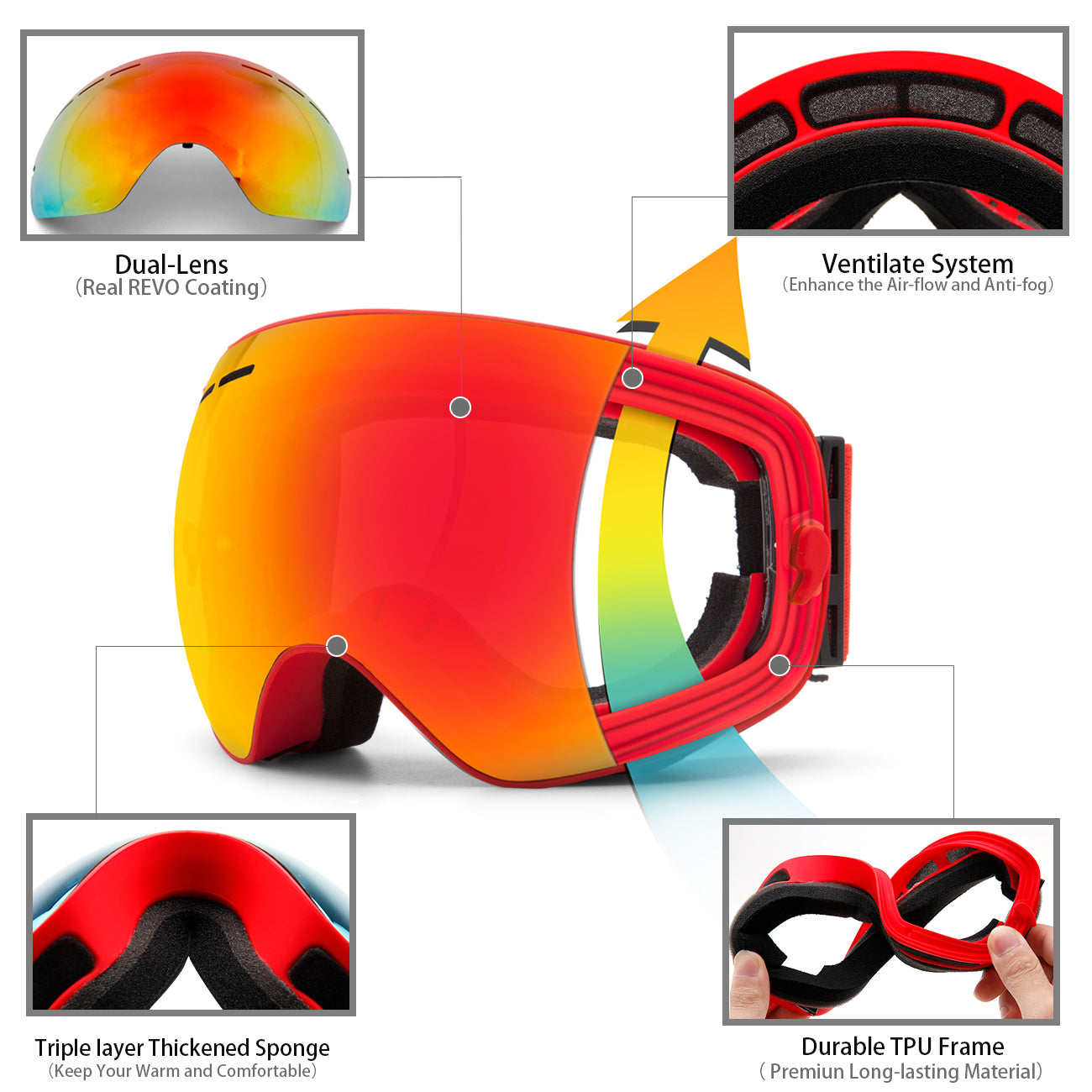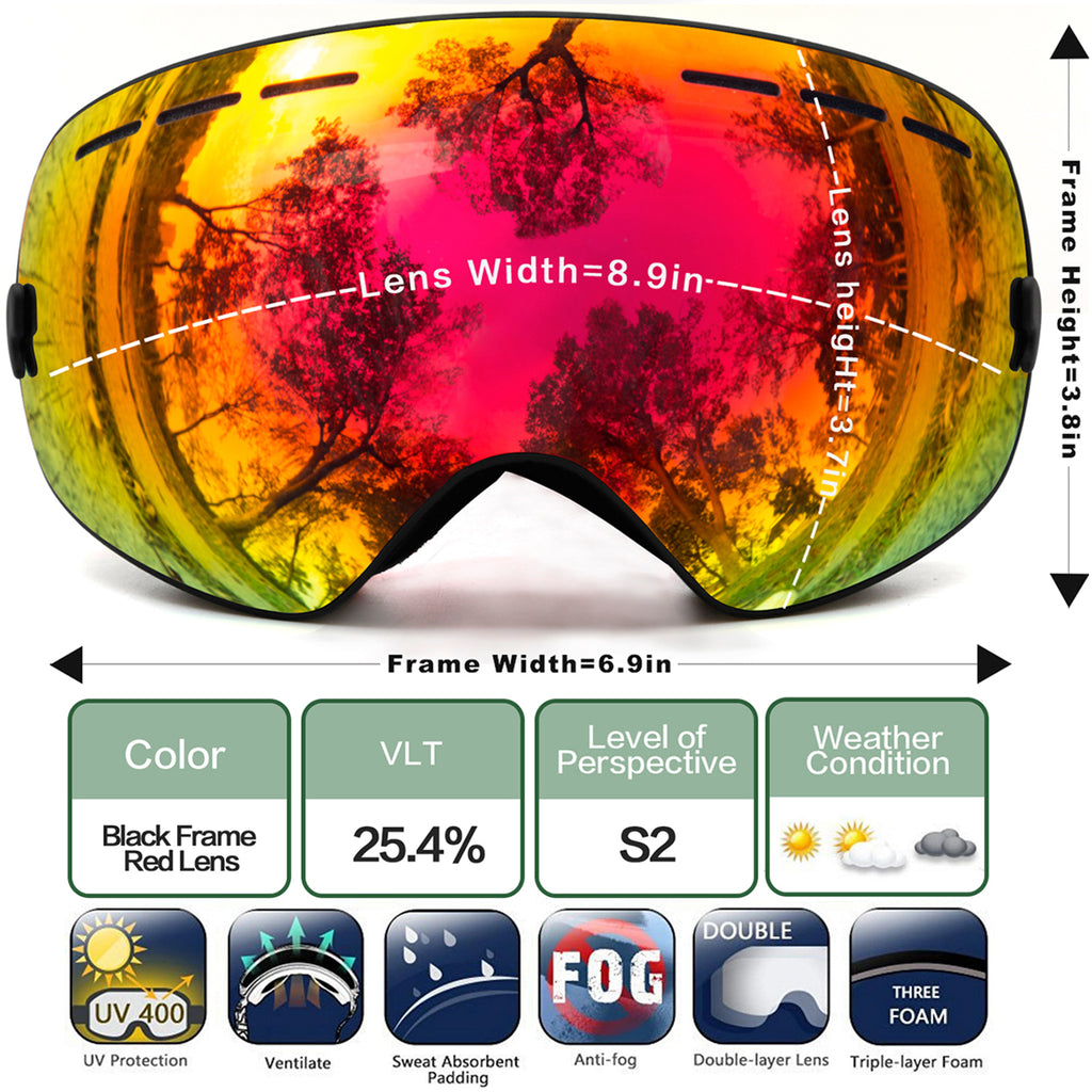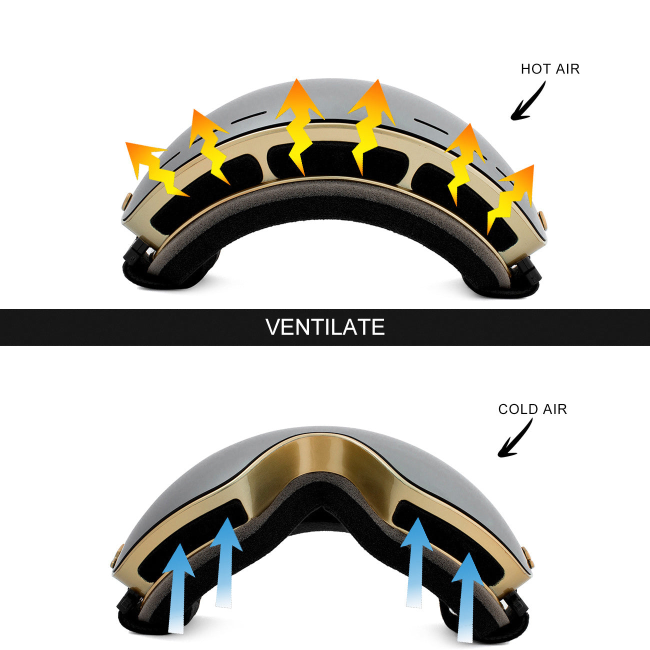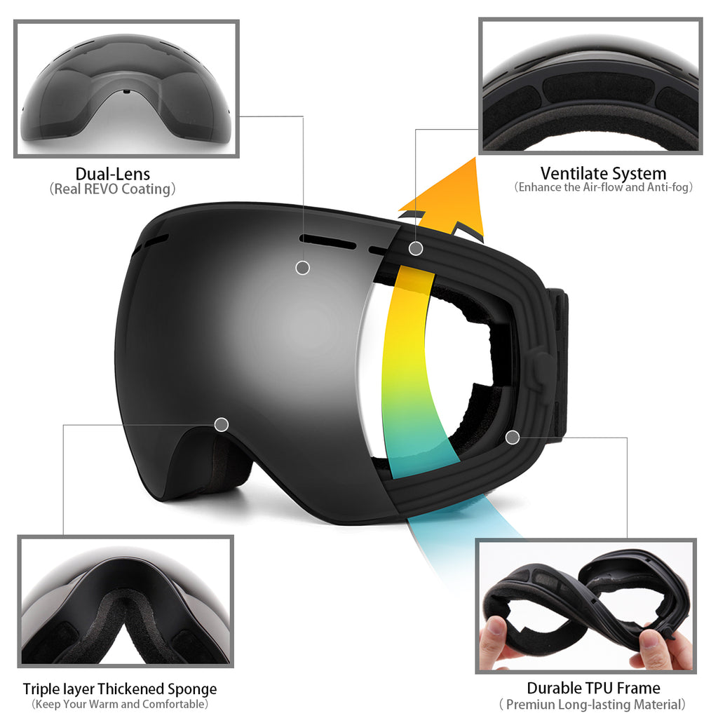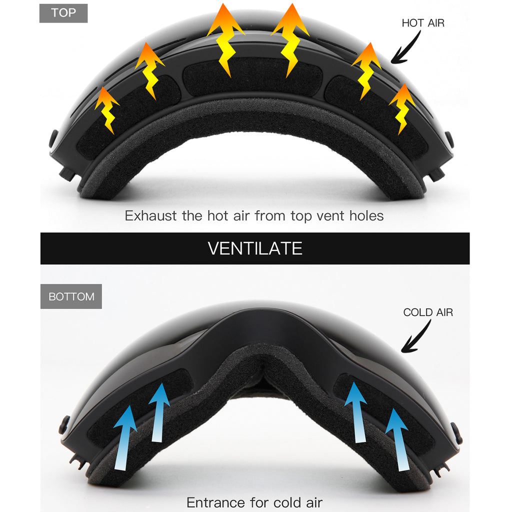 PROFESSIONAL VENTILATION & FRAMELESS DESIGN-Designed to reduce fogging and optimizes the flowing air over the inside of the lens. ski goggles provide smooth air-flow system which brings fresh air and exhaust moisture quickly and effectively. The big, spherical, frameless lens provides a truly unobstructed & clear view of the slopes.