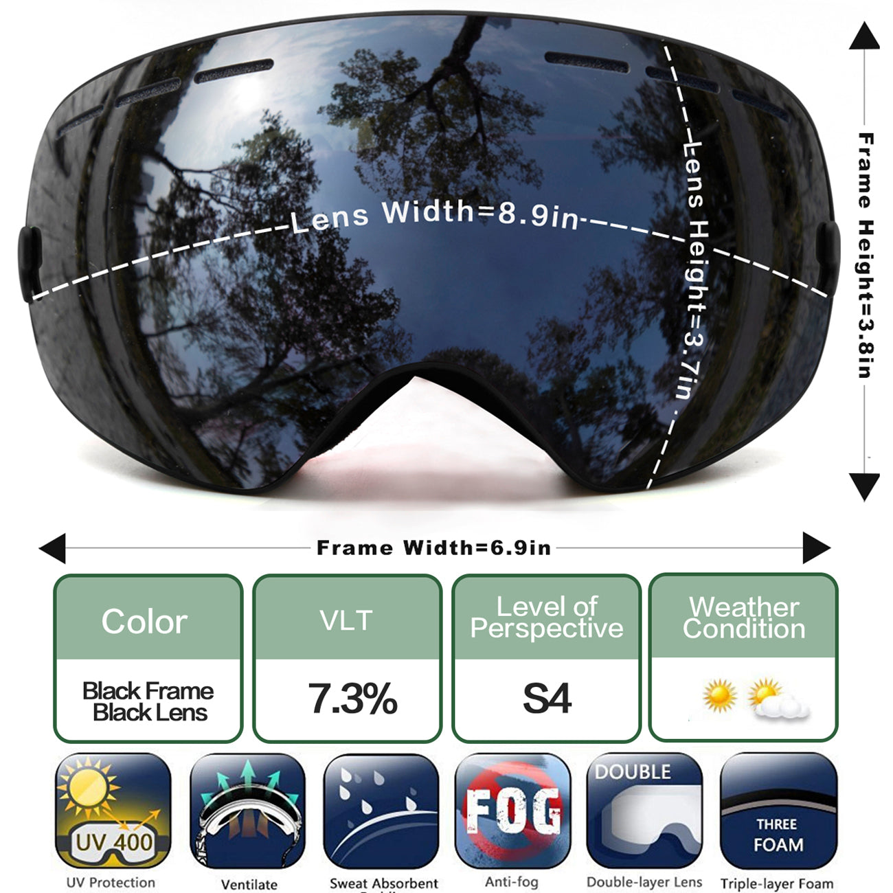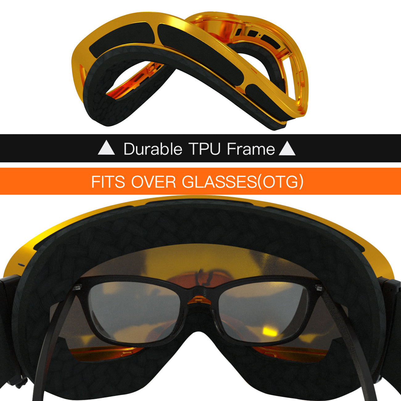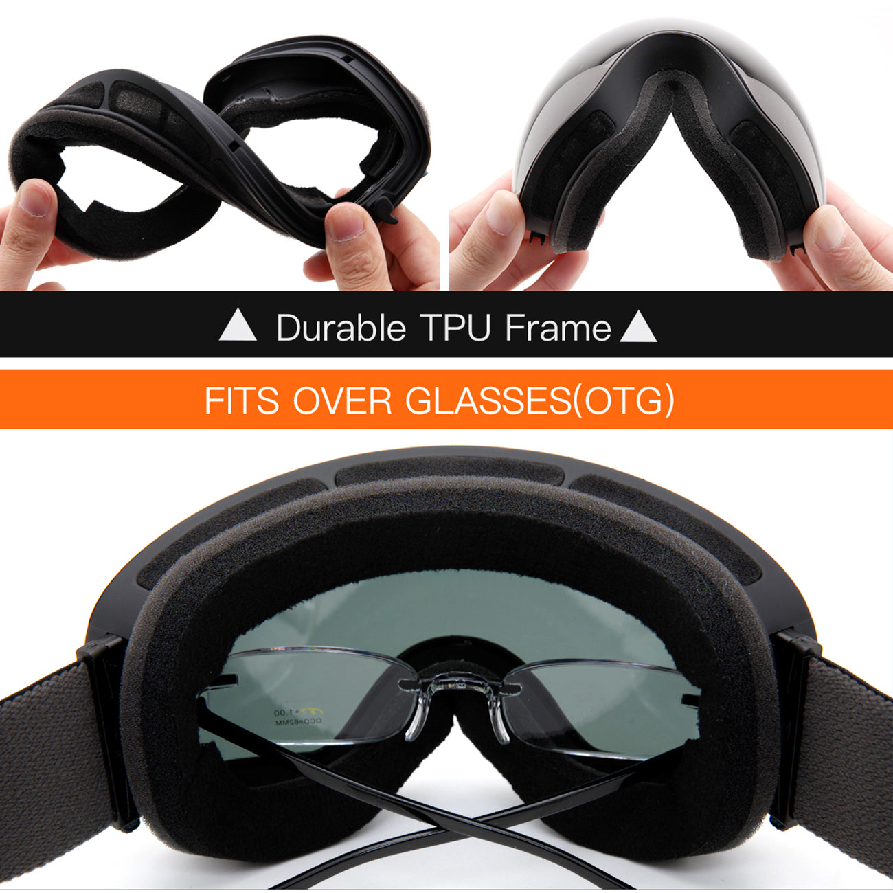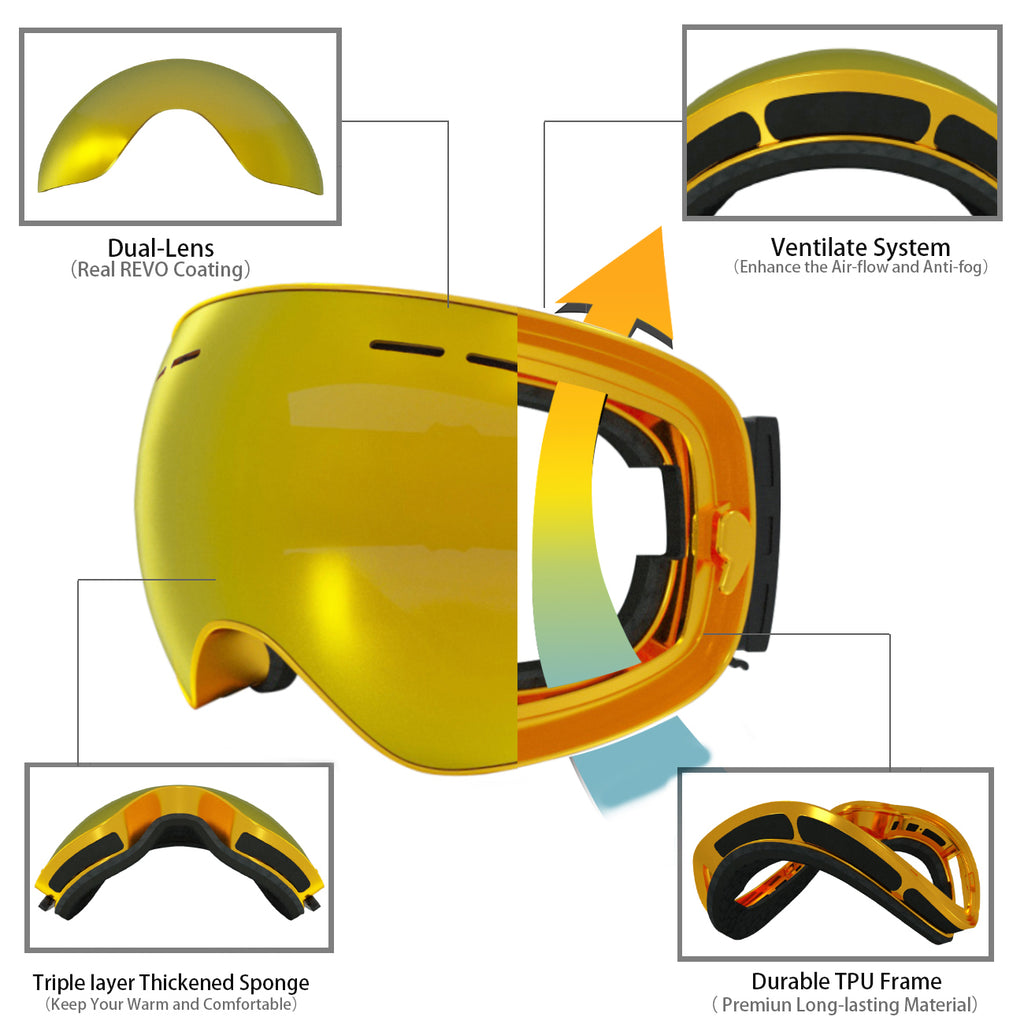 PROFESSIONAL VENTILATION & FRAMELESS DESIGN-Designed to reduce fogging and optimizes the flowing air over the inside of the lens. ski goggles provide smooth air-flow system which brings fresh air and exhaust moisture quickly and effectively. The big, spherical, frameless lens provides a truly unobstructed & clear view of the slopes.