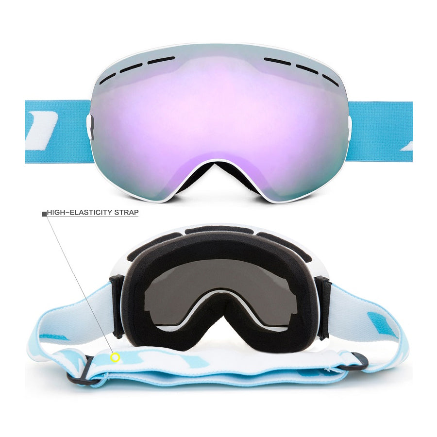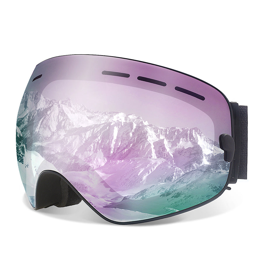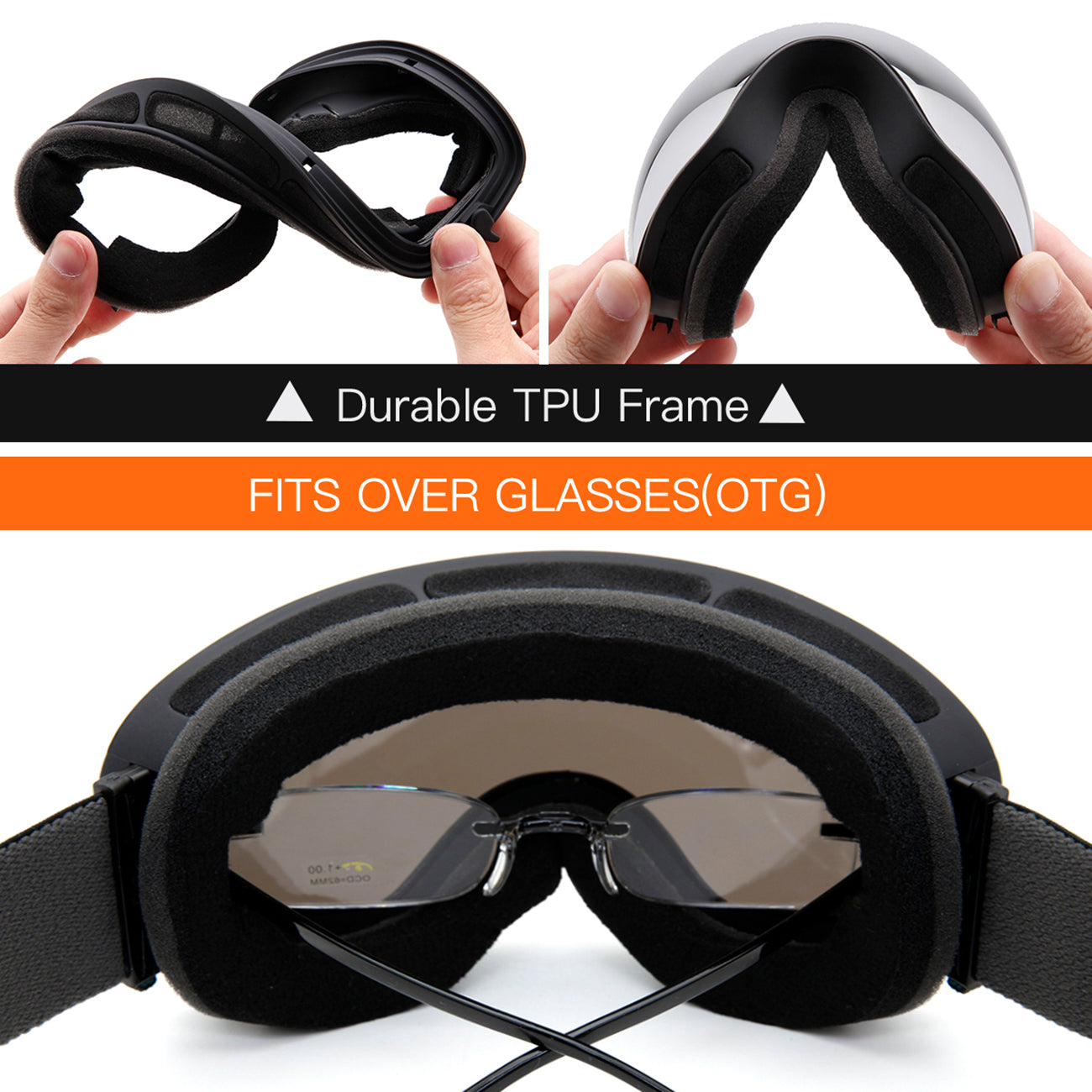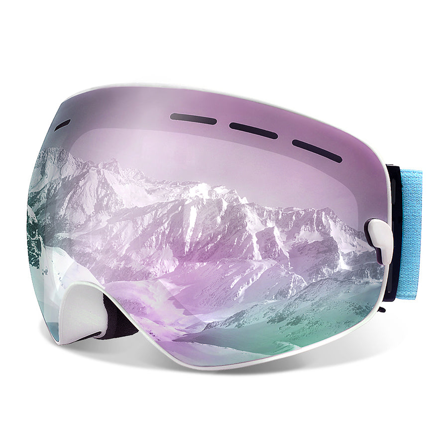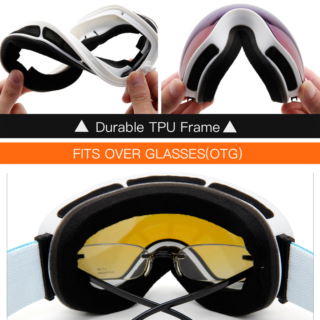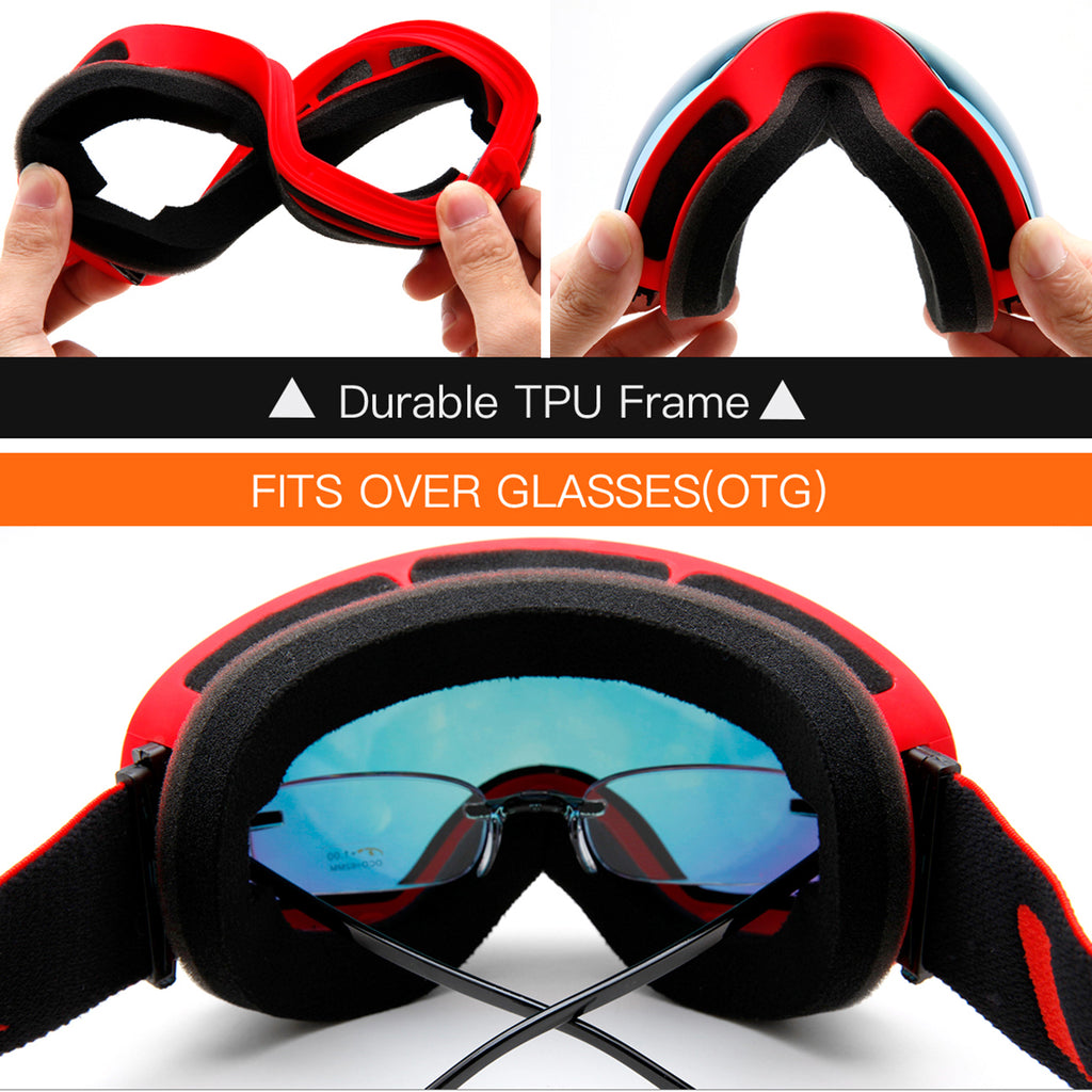PROFESSIONAL VENTILATION & FRAMELESS DESIGN-Designed to reduce fogging and optimizes the flowing air over the inside of the lens. ski goggles provide smooth air-flow system which brings fresh air and exhaust moisture quickly and effectively. The big, spherical, frameless lens provides a truly unobstructed & clear view of the slopes.